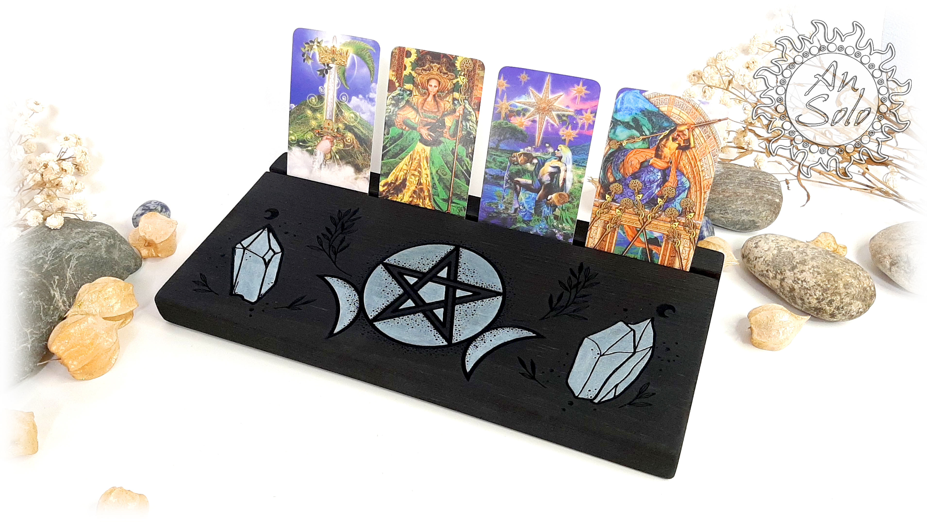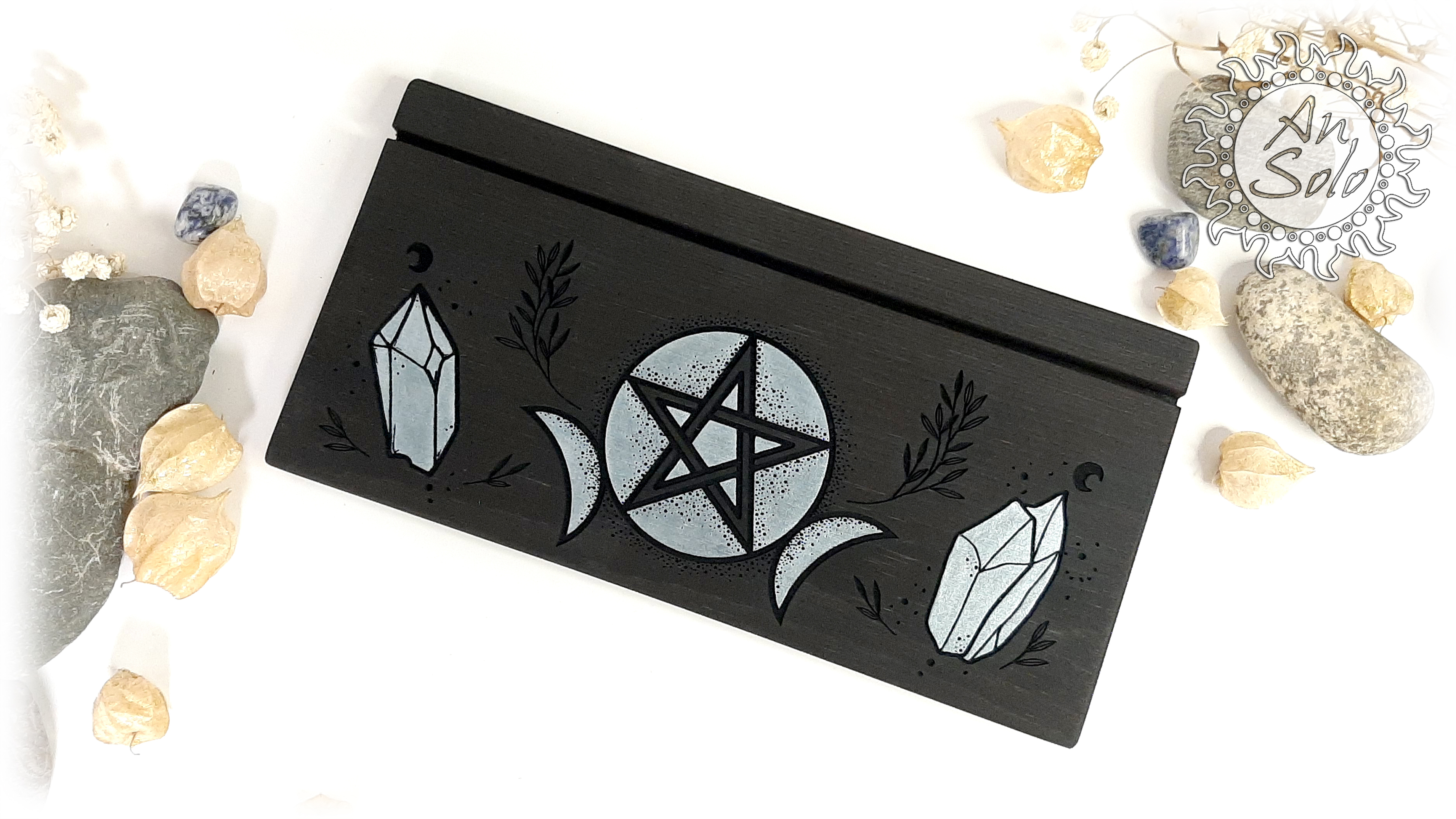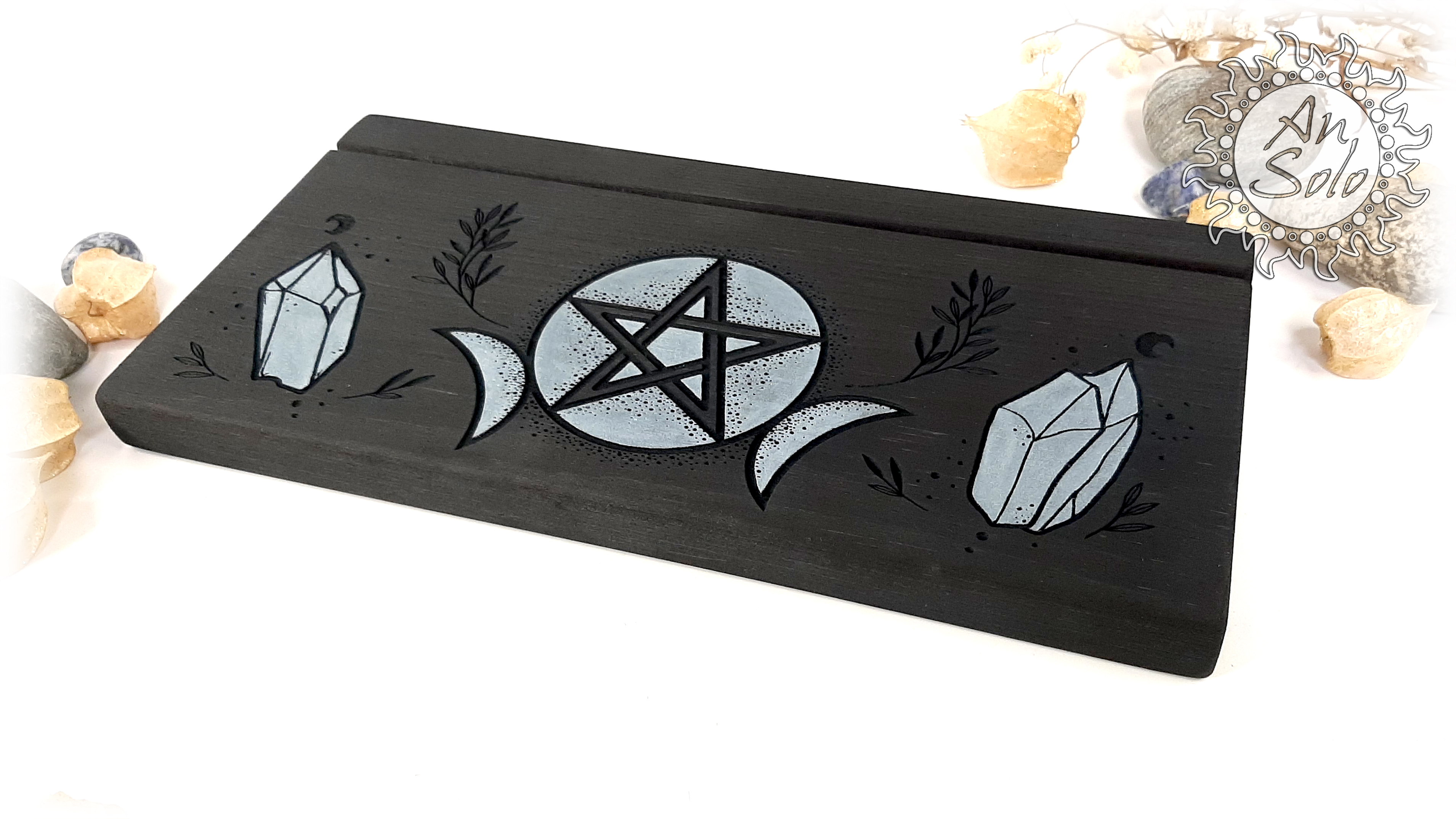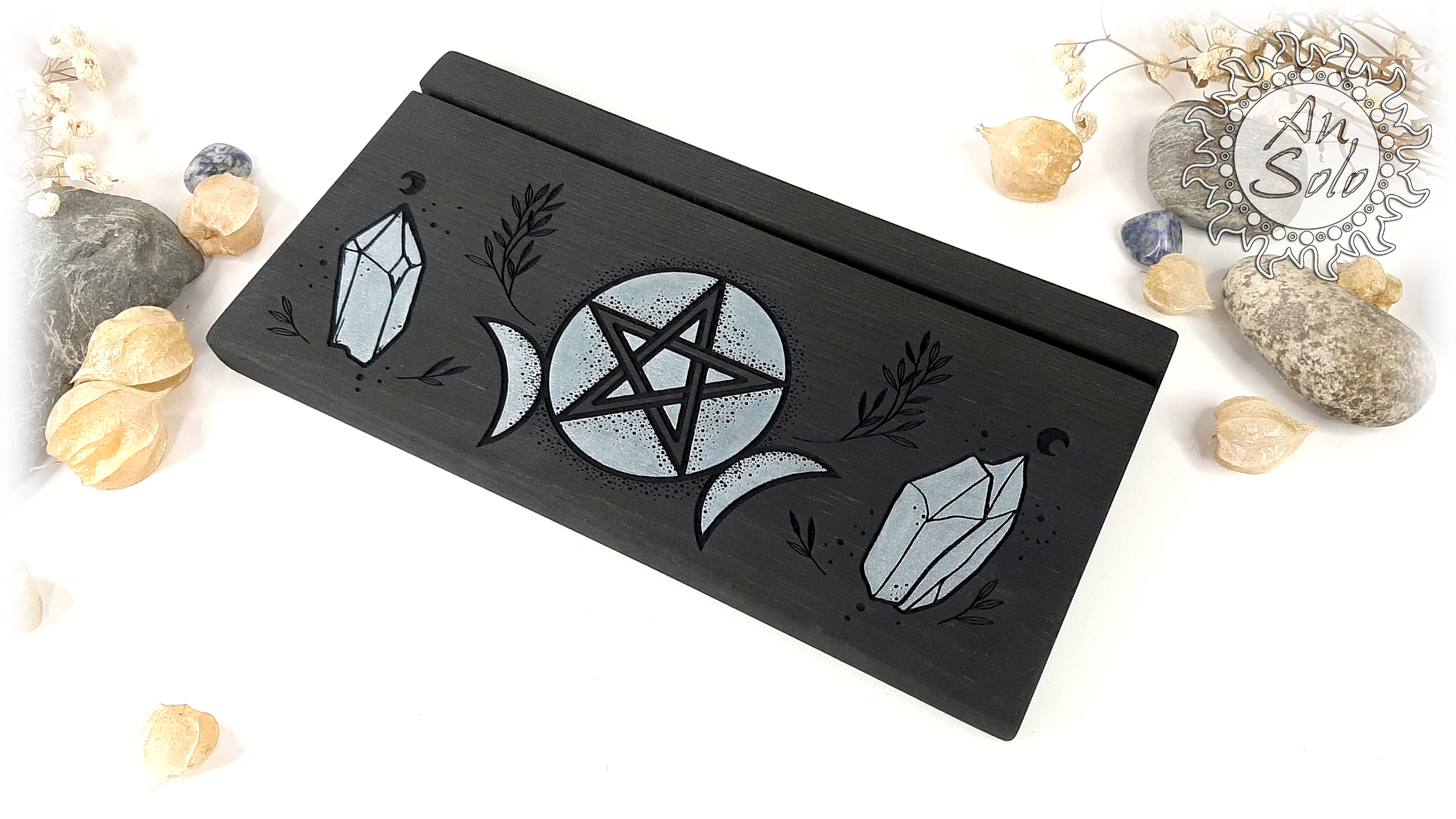 Алтарь для карт таро выполнен из массива сосны, имеет очень красивый вид за счет древесной фактуры и оригинальному рисунку. Доска для таро может вместить ориентировочно 7 карт, далее по вашему усмотрению.