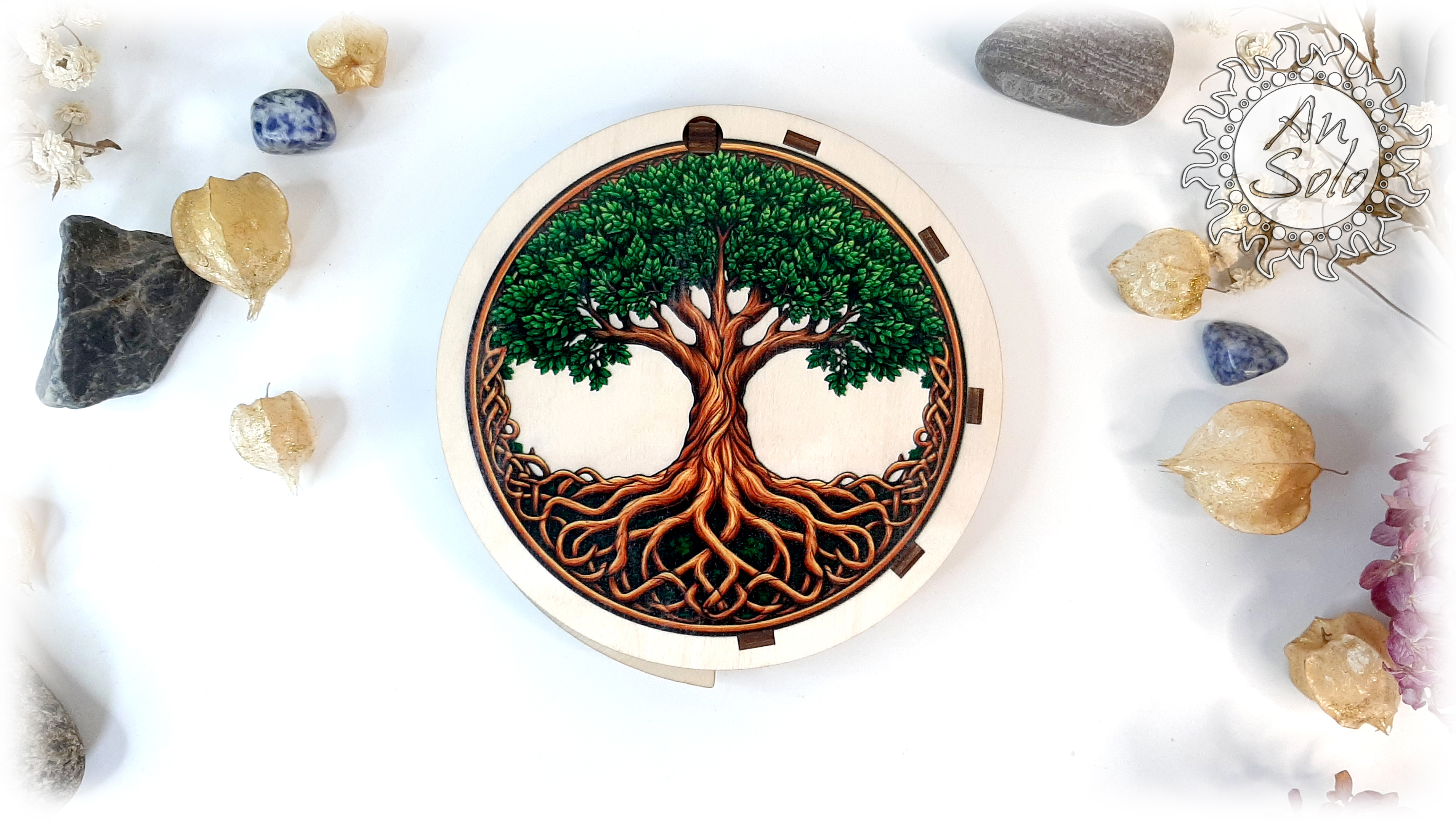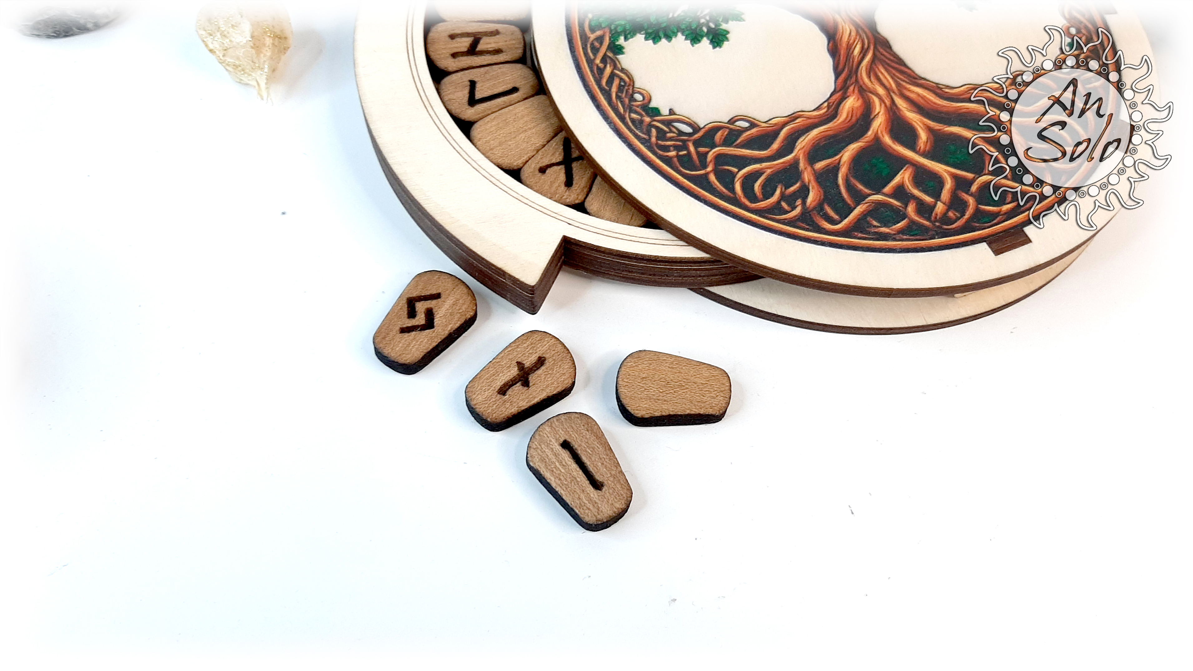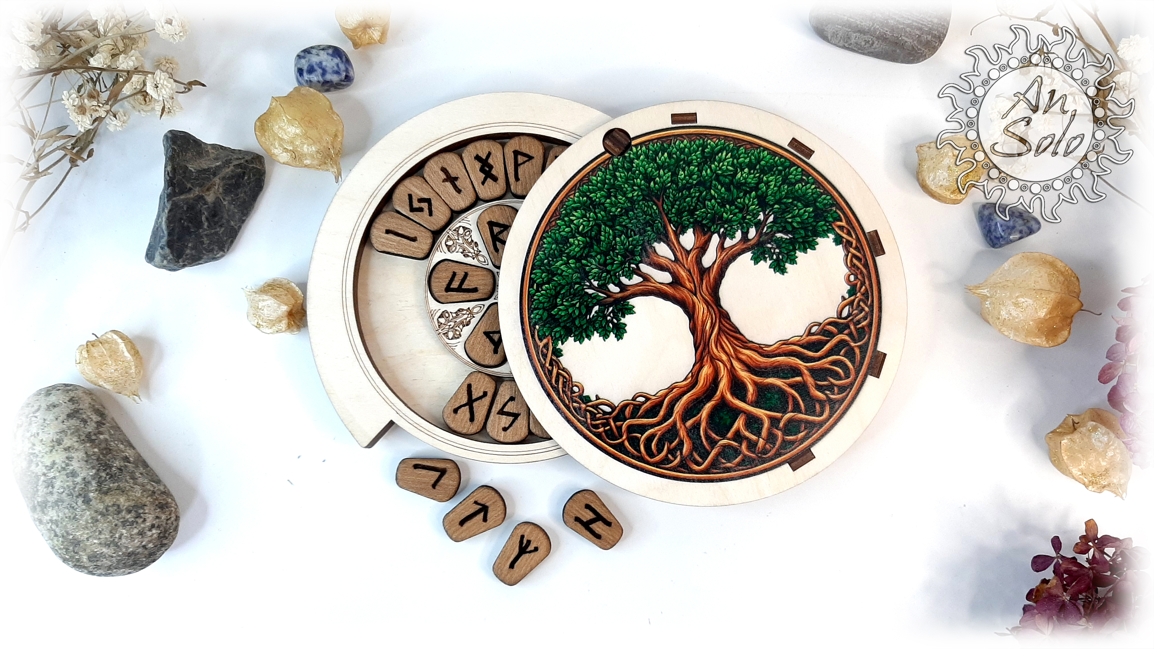 Набор скандинавских рун из натурального дуба в круглой деревянной шкатулке с цветным рисунком древнего Мирового древа Иггдрасиля в окружении футарка. Шкатулка надежно сохранит ваши руны, а крышка шкатулки может послужить мини-алтарем в путешествиях, когда нет возможности обратиться к вашему основному рабочему месту.